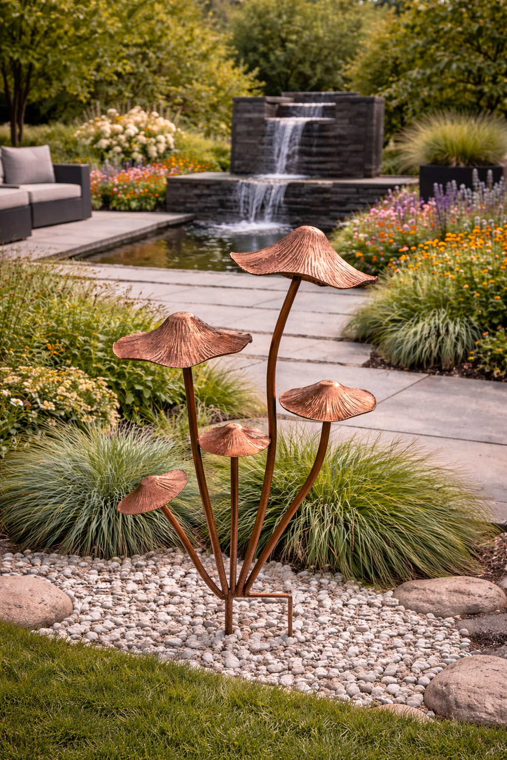 Add character and charm to your outdoor space with this bronze metal mushroom garden stake. Featuring five delicately shaped mushroom caps at varying heights, this sculptural piece brings a whimsical woodland feel to gardens, borders, planters, and pathways.