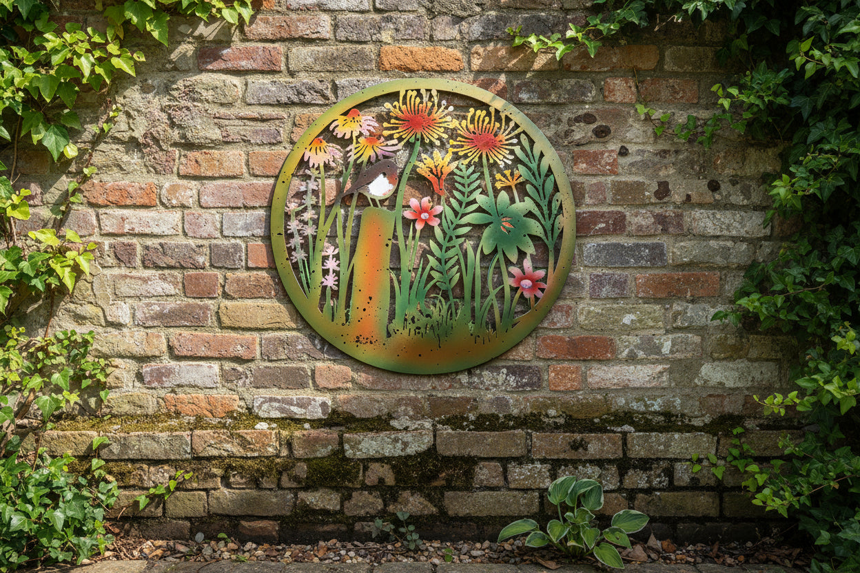 🌸 Handmade 60cm Powder Coated Metal Wall Art – Garden Bird & Wildflowers Design