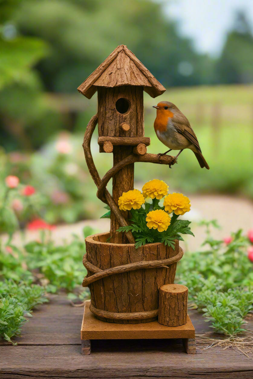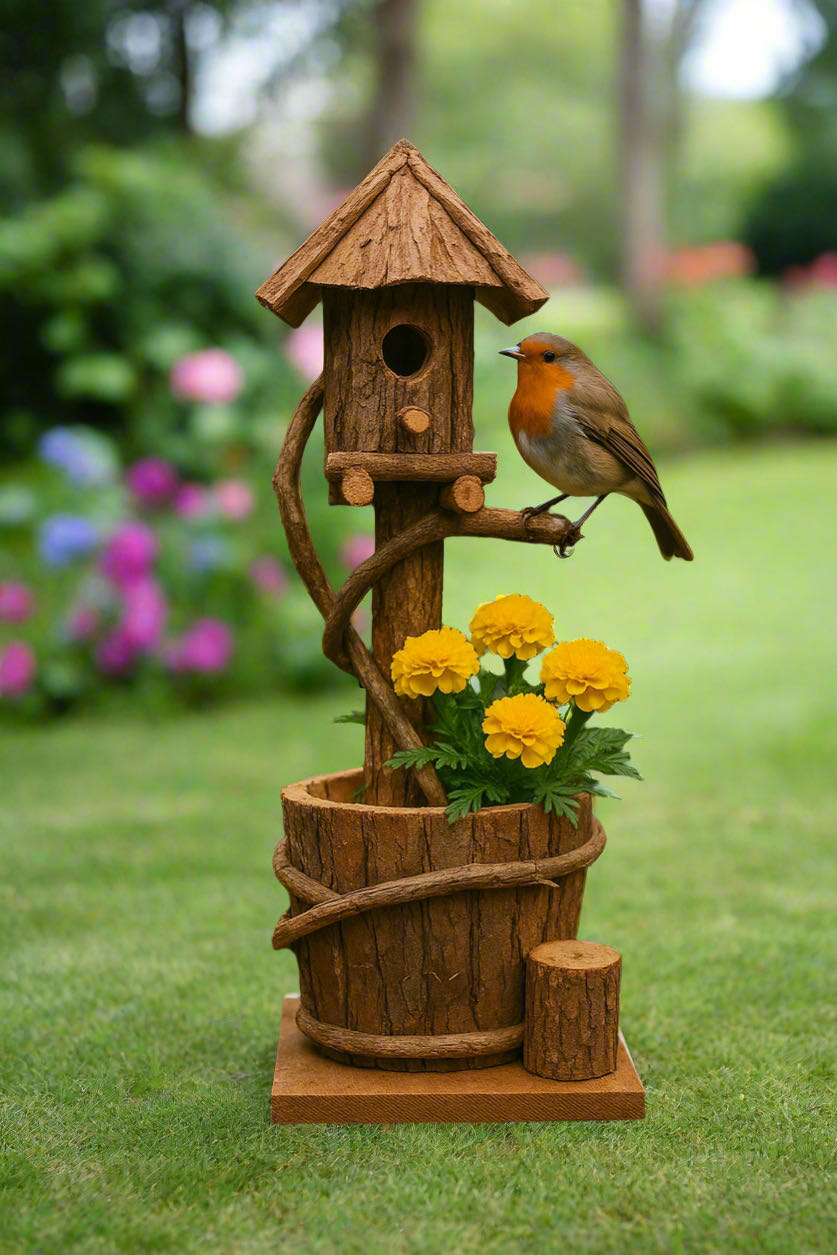 Each birdhouse is individually handmade from natural wood, giving it a unique character and a warm, rustic feel. The birdhouse offers a safe and cozy nesting spot, while the planter brings a splash of color and life—making it both decorative and practical.