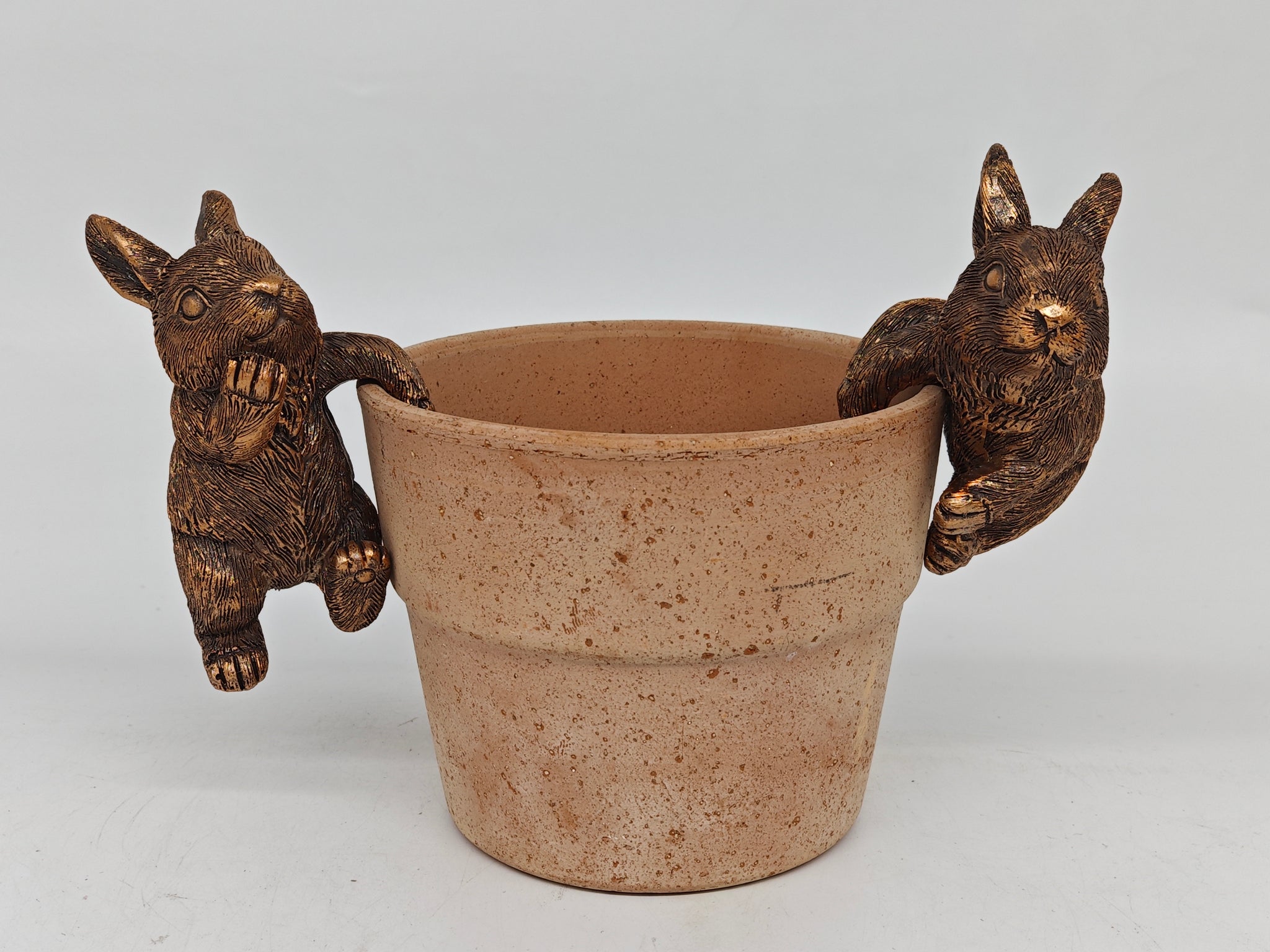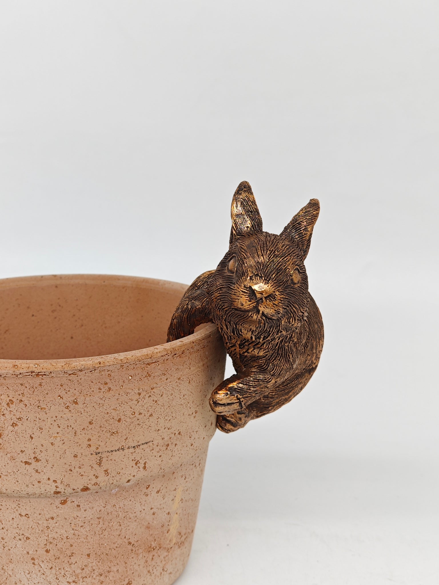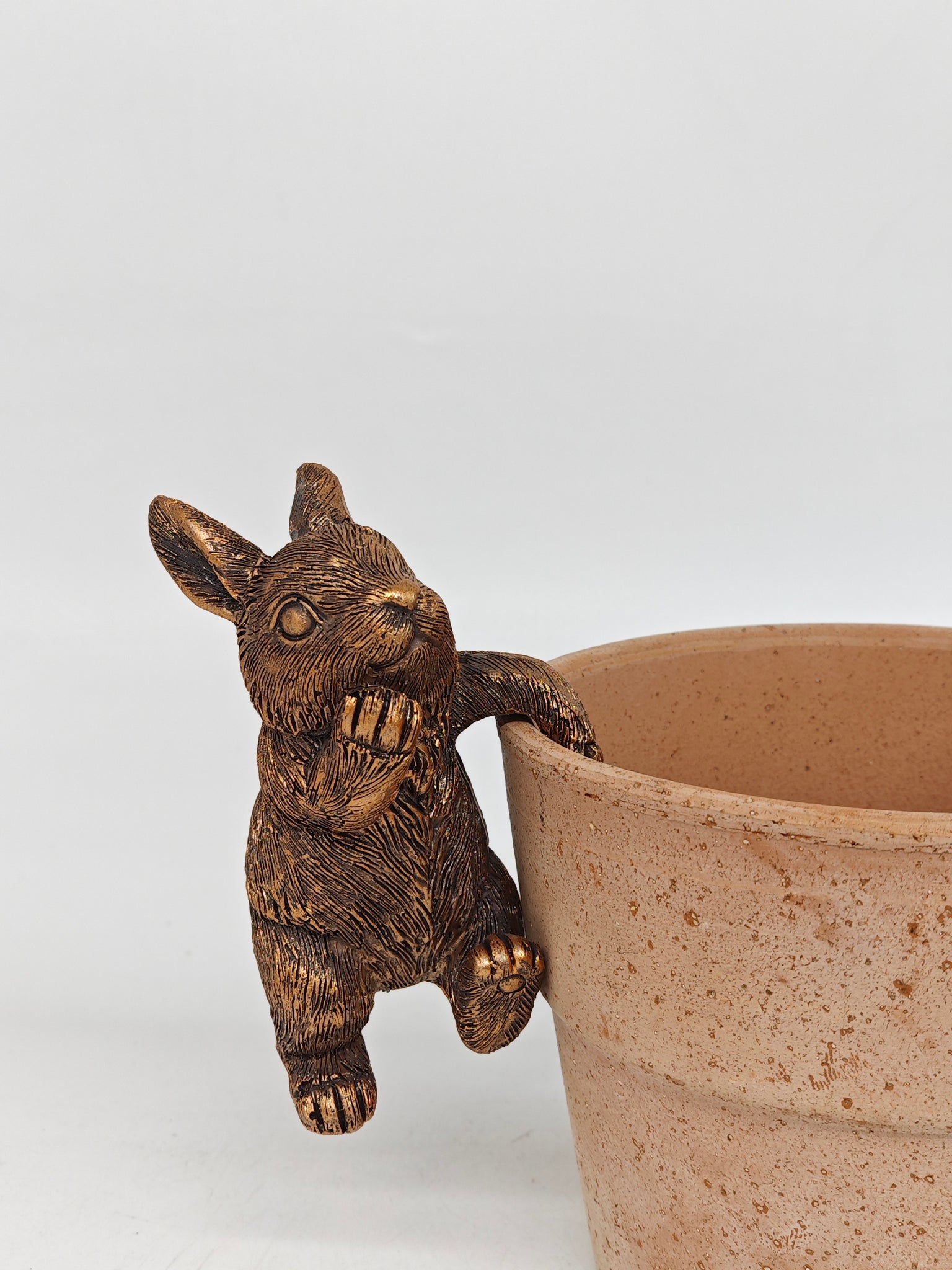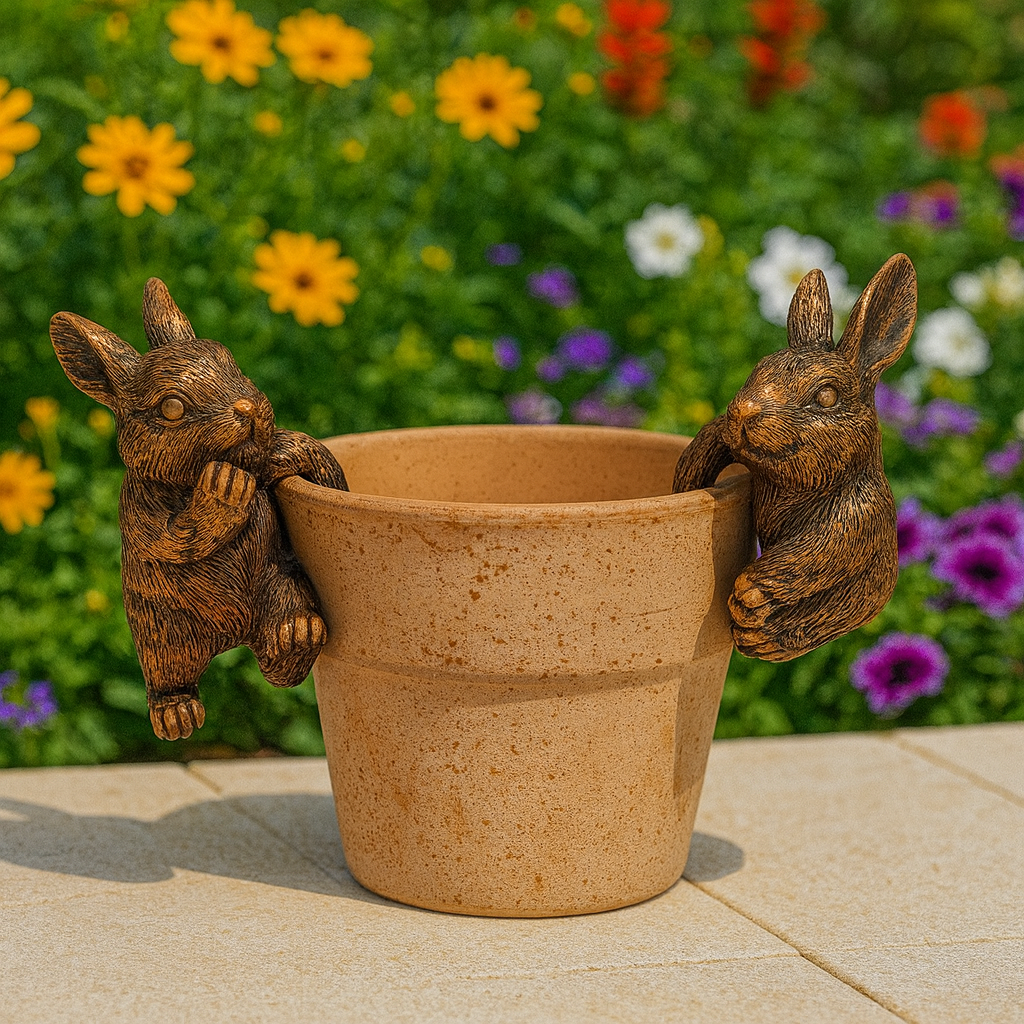 A charming and durable pair of rabbit figurines cast in polyresin with a bronze-finish, designed to act as decorative pot hangers. Ideal for elevating your plant pots or decorative vessels, combining whimsical design with functional support.