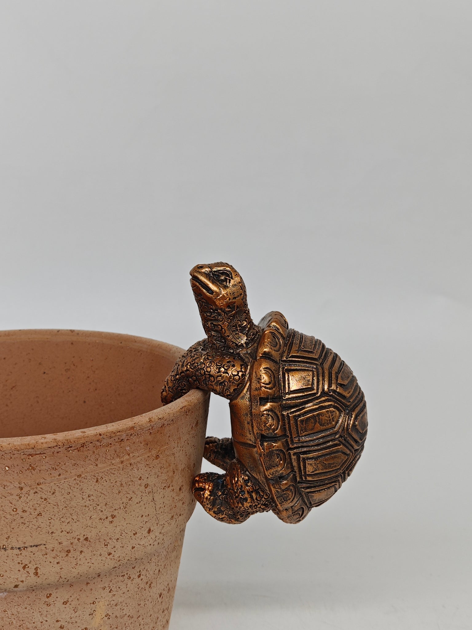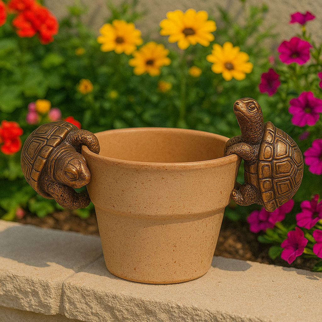 A charming and durable pair of turtle figurines cast in polyresin with a bronze-finish, designed to act as decorative pot hangers. Ideal for elevating your plant pots or decorative vessels, combining whimsical design with functional support.