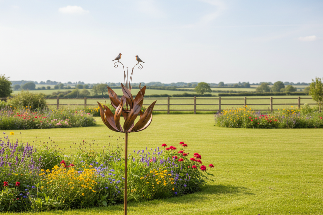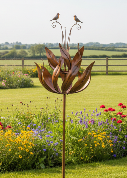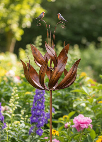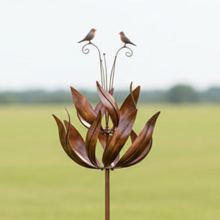 Graceful and eye-catching, this Bronze Robin Wind Sculpture brings movement, beauty, and meaning to any garden space. Designed as a striking kinetic garden ornament, the sculpture features two elegant leaf-shaped sails that spin gently in the breeze—one turning one way while the other rotates in the opposite direction. This mesmerising motion creates a calming and ever-changing display as the wind passes through your garden.