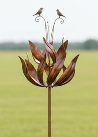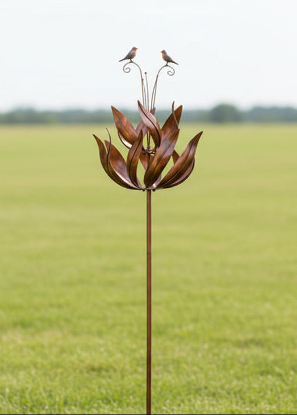 Crafted from durable powder-coated metal with an elegant bronze finish, this wind spinner is designed to withstand the elements while maintaining its striking appearance throughout the seasons. Whether placed in a lawn, flower bed, or garden border, it creates a captivating focal point that moves effortlessly with the wind.