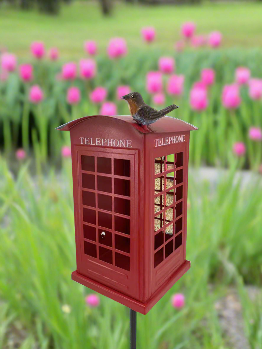 Handmade Red Telephone Box Bird Feeder nest – Garden Outdoor Decor with Robin Accent
