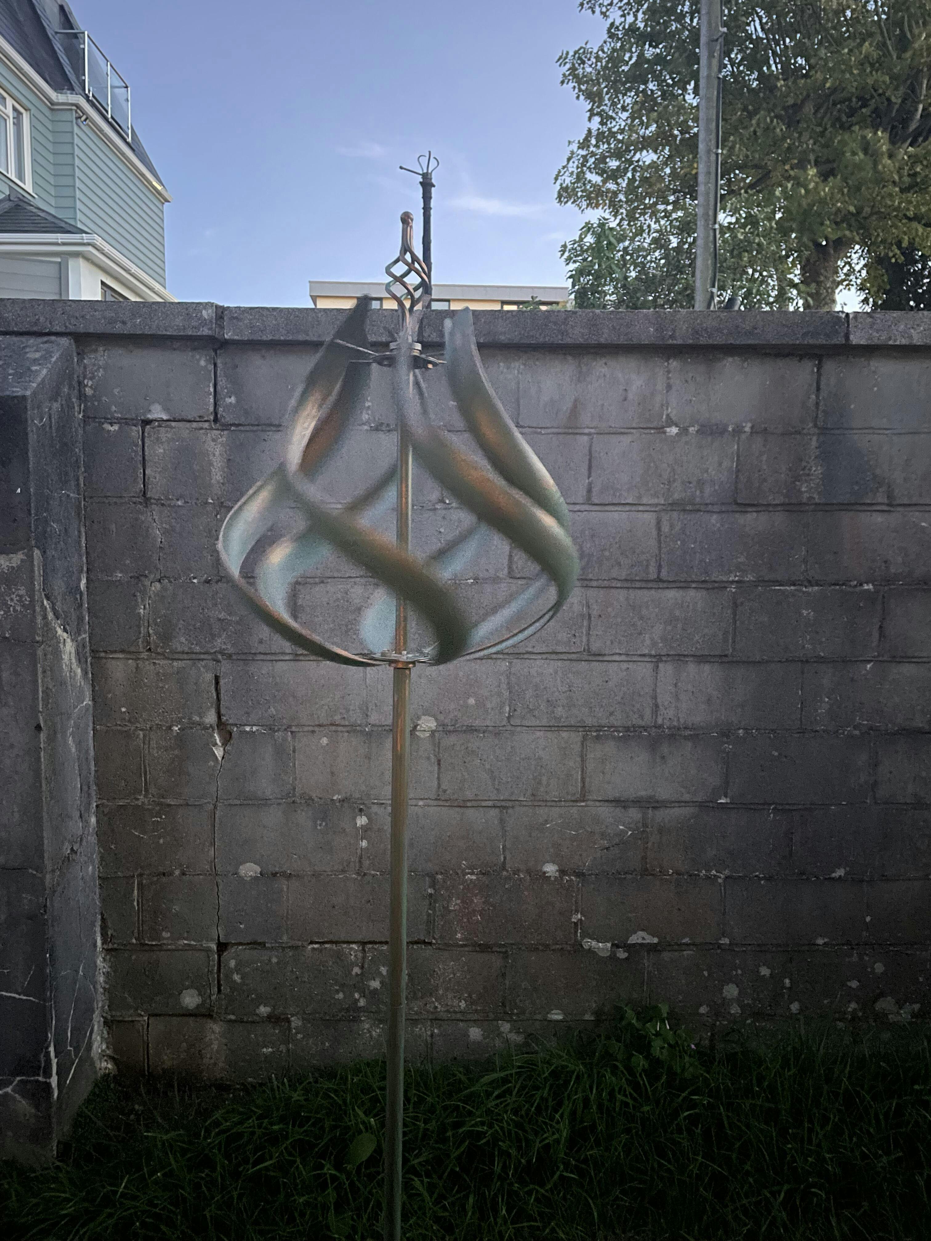 A simple but well designed wind sculpture spinner. Good and strong construction with solid support poles. Easy, straightforward assembly required. The verdigris colour is pleasing to the eye. An elegant addition to the garden.